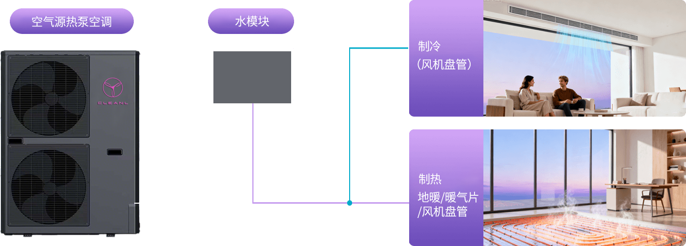 科麟空气源热泵技术,吸收室外空气中的能量,通过较少的电能,将免费自然资源用于冷却或加热室内的空气。
